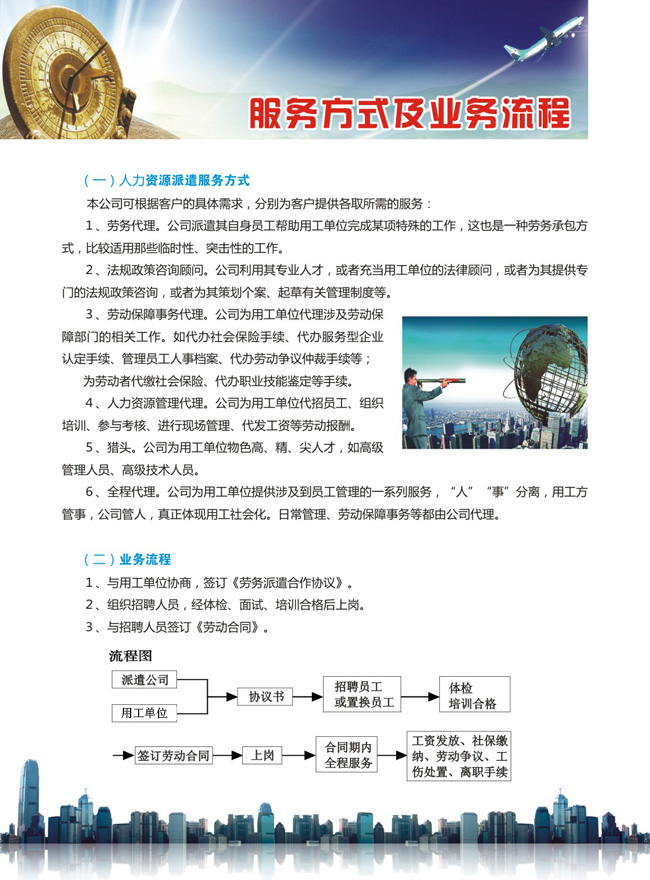 本公司提供涵蓋勞動(dòng)者招聘、錄用、崗前培訓(xùn)、社保繳納、工傷理賠、勞動(dòng)爭(zhēng)議、員工離職等用工方面的全方位一站式服務(wù)。